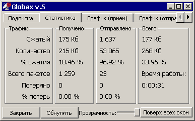 В поле Сжатый показывается объем трафика реально переданного через каналы связи (Получено - спутниковый, Отправлено - "наземный"), в поле Количество - объем "полезных" данных (которые были переданы бы без использования сжатия Globax). Обратите внимание - при приеме больших объемов несжимаемой информации (медиа-файлов, файлов программ и т.п.) количество переданной информации может быть больше, чем объем файлов, а процент сжатия - отрицательным. Также отрицательный процент сжатия может наблюдаться при большом количестве ошибок - из-за попыток Globax 5 повторно доставить потерянную информацию.