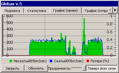 Закладки График (прием) и График (отправка) показывают статистику по приему (спутниковый канал) и отправке (наземный канал) в графическом виде. Отображается скорость приема и передачи данных (левая шкала, в кбит/с), а также процент ошибок (правая шкала, в процентах). Статистика отсчитывается от момента запуска Globax 5 или от нажатия кнопки Обнулить.