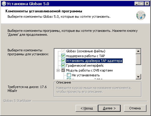 Установить драйвера TAP-адаптера - Если TAP-адаптер не установлен, то Globax можно использовать только в режиме "прокси". Если Вы используете другие программы, работающие через TAP-адаптер (Slonax 3G и т.п.), то можно не отмечать этот пункт - TAP-адаптер у вас уже установлен. Но если нет полной уверенности, то лучше отметить - переустановка TAP-адаптера не приведет к нарушению работоспособности других использующих его программ (если не запускать их одновременно с Globax 5).