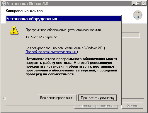 Если в процессе установки система сообщит о том, что устанавливаемый TAP-адаптер не прошел тестирования на совместимость, нажимайте Все равно продолжить: