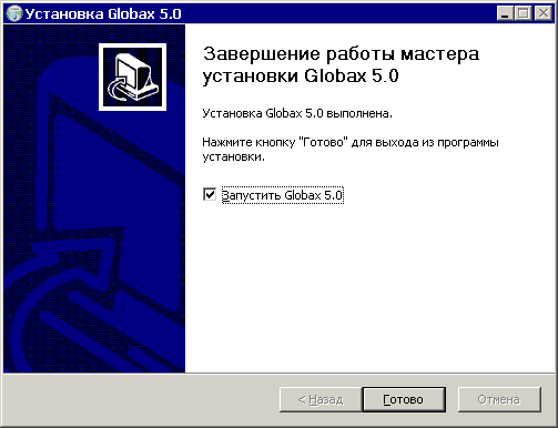 Нажмите Готово для запуска клиента. Если Вы не хотите запускать клиента сразу после установки, снимите ключ Запустить Globax перед тем, как нажать Готово.