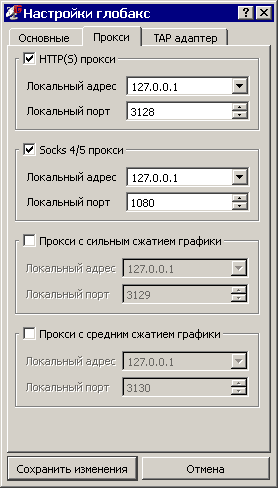 Для работы через прокси необходимо указать в настройках браузера адрес и порт прокси в соответствии с настройками Globax 5. Возможна одновременная работа через прокси и TAP-адаптер (брааузер с установлеными настройками прокси будет работать через прокси, программы, где не установлены настройки прокси - через TAP-адаптер).