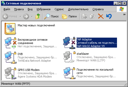 На "центральном" компьютере должна быть настроена плата спутникового приема и подключение к сети StarBlazer через VPN или через Slonax 3G. Убедитесь, что с данного компьютера работает доступ к услуге SB Hybrid. Откройте список сетевых подключений на "центральном" компьютере. Если вы используете VPN, то выберите в списке сетевых подключений настроенное VPN-подключение к StarBlazer.