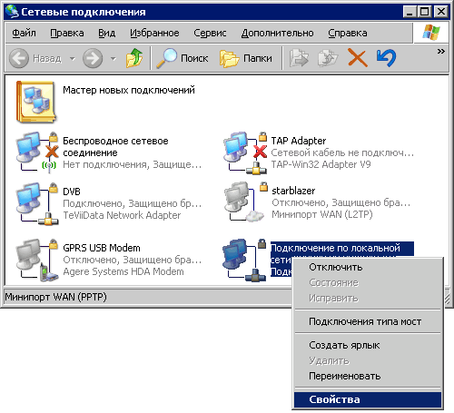 Нажмите на выбранном типе подключения правой кнопкой мыши и выберите "Свойства":